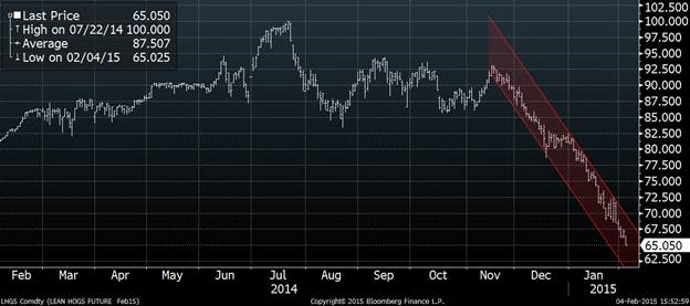 Porc : -2.10 à 65.10 sur fév’15 et -3.00 à 79.63 sur juin’15