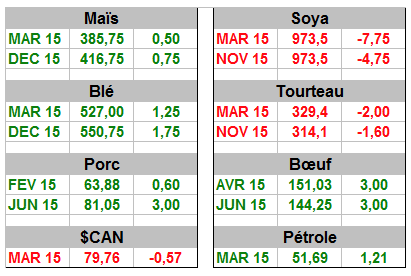 - Le prix des grains reste stable dans l`attente du rapport de mardi prochain qui ne devrait pas trop faire bouger les marchés selon les experts. Il sera intéressant de voir si la production d`éthanol sera révisée à la hausse. La moyenne des estimés concernant les inventaires de fin de saison sont de 1.877 millions de boisseaux pour le maïs et de 398 millions de boisseaux pour le soya.