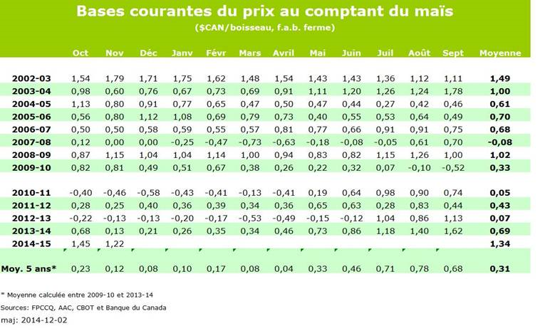 La base actuelle est historiquement haute, il faut retourner fin 2003 pour voir de la base aussi attrayante (voir figure 1). Beaucoup de maïs se trouve encore sur la ferme et les producteurs devront faire vite pour sortir ce produit et faire de la place pour la nouvelle récolte ce qui devrait amener une pression à la baisse sur la base.