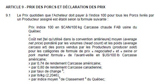 La décision 9226 de la RMAAQ intitulée « convention de mise en marché des porcs » rectifiée en octobre 2009 encadre le prix payé par l’abattoir et reçu pour le producteur entre autres modalités. Vous trouverez à la FIGURE 1 ici-bas, l’article 9 de ce règlement, la grille de calcul utilisé.