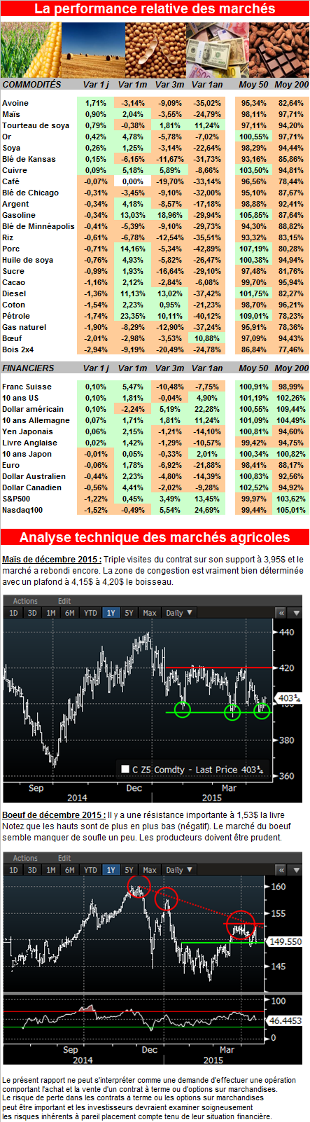 Sur une note positive, les Fonds d’investissement ont une position nette sur le maïs estimée de -75,825 contrats sur la fermeture d’aujourd’hui (voir graphique). Ils sont rarement net vendeur et le marché peut ainsi remonter vite sur des couvertures de positions.