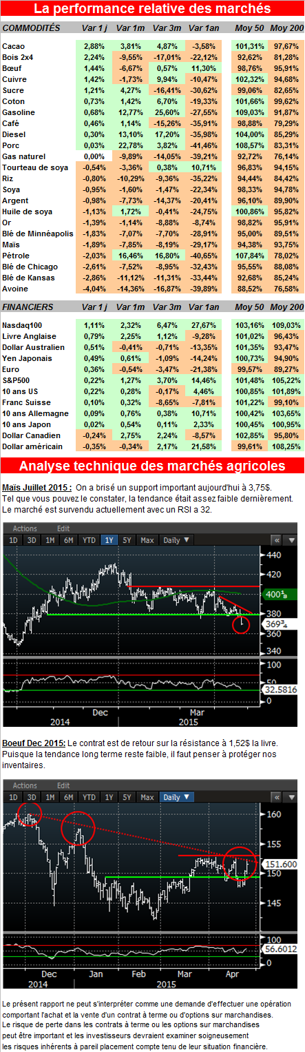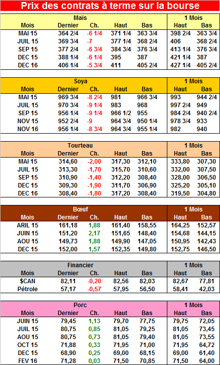 Les ensemencements de maïs sont probablement complétés à environ 18 à 20% présentement et on risque d’être à 50 - 60% d’ici la fin du mois. Dans plusieurs États clés, la météo sera favorable selon les derniers bulletins météorologiques. Historiquement, les fermiers américains ont tendance à accélérer leurs ventes d’ancienne récolte quand on s’approche du seuil de 50% planté.