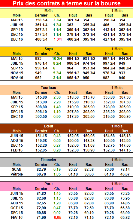 Hausse de 1.7 cent de la découpe de porc aujourd’hui. Le contrat du mois de mai a terminé en hausse de 2.5 cents à 79.42. Le marché anticipe que le prix du comptant va poursuivre sa forte hausse au cours des prochains jours. La récente baisse du dollar américain a sûrement du donner un petit coup de pouce sur les exportations. A noter les abattages de la semaine sont seulement 5.8% plus élevés que l’année dernière. Il sera intéressant de voir si la USDA va réviser à la hausse dans son rapport du 12 mai la consommation américaine de porc pour refléter la situation dans la volaille.