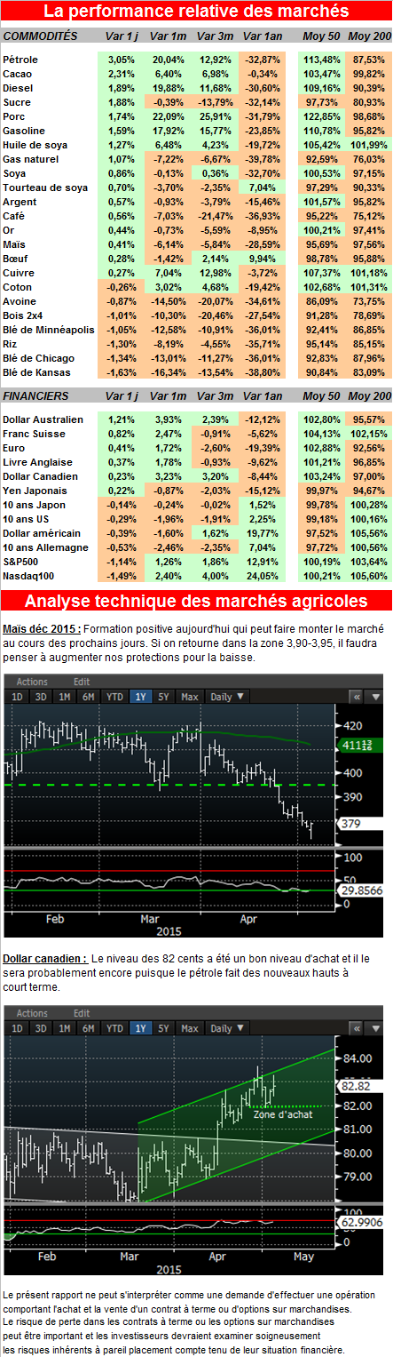Le prix du blé était très faible à l’ouverture ce matin. L’Égypte a confirmé des achats importants à la Russie. Cela confirme que le blé américain n’est pas compétitif et les ventes à l’exportation seront possiblement révisées à la baisse. La tendance n’est pas trop forte comme vous pouvez le constater dans le graphique plus bas.