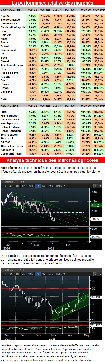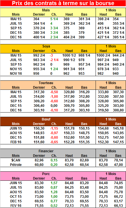 Les exportations de porc pour le mois de mars dernier ont fortement augmenté à 439 millions de livres en hausse de 16% par rapport à février. Les exportations de porcs américains sont en baisses de 9% par rapport au mois de mars de l’année dernière, mais il faut se souvenir qu’il y a eu beaucoup de panique en raison de la DEP de la part des importateurs qui pensaient manquer de viande. La moyenne mensuelle des exportations de 2014 était de 406.7 millions de livres donc on se dirige dans la bonne direction. Depuis le 1er avril, le dollar américain a baissé de 5%. Par conséquent, la cadence des exportations risque de rester forte puisque le porc américain devient plus compétitif sur les marchés internationaux.