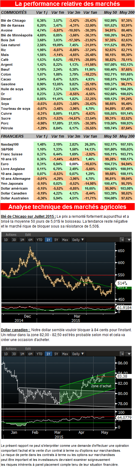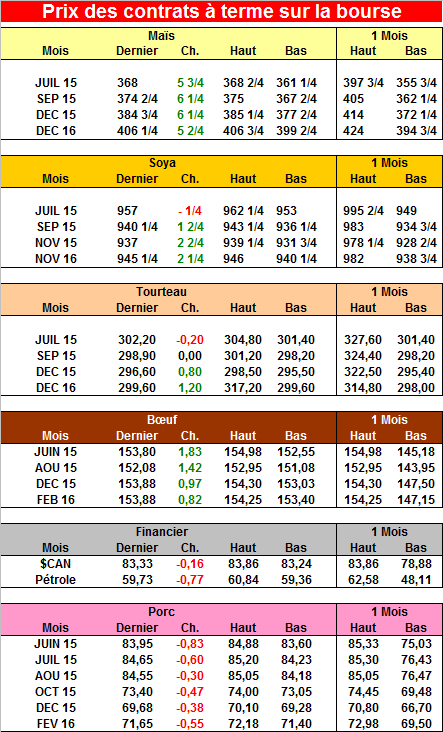 Il annonce de très fortes précipitations dans l’État du Kansas ou une grande partie du blé d’hiver est produit. Plusieurs experts évaluent qu’ils risquent maintenant d’avoir beaucoup trop d’eau et le rendement anticipé risque de diminuer. Je pense que les fonds de couverture avaient poussé le marché un peu trop bas. La tendance du marché reste négative et il y a une résistance très importante entre 5.25$ et 5.50$ le boisseau.