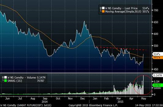 Hausse de 6.8% du prix du blé aujourd’hui sur un volume très important de 146,000 contrats ! Les fonds de couverture ont racheté une grande partie de leurs positions aujourd’hui. Ils avaient des positions nettes estimées de 111,000 contrats vendus à découvert pariant sur une baisse des prix.