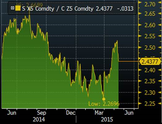 Informa, une firme spécialisée dans l’agriculture, estime que les surfaces ensemencées en soya pourraient atteindre 87.2 millions d’acres comparativement aux 84.6 d’acres estimés par la USDA. Si Informa est juste et que le rendement est de 46 boisseaux à l’acre on pourrait se retrouver avec des inventaires de fin de plus de 600 millions de boisseaux ! Je pense que le ratio Soya/Maïs risque de continuer sa récente tendance baissière (voir graphique).