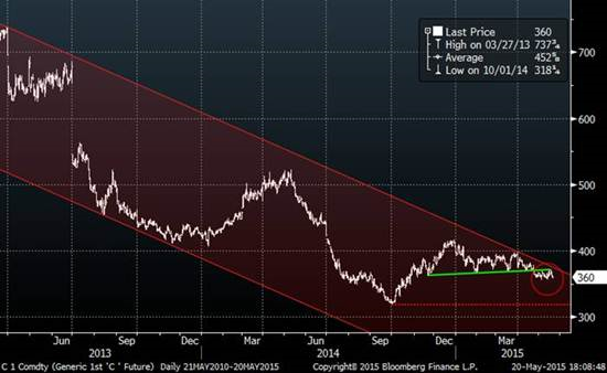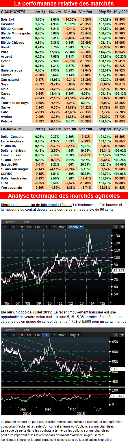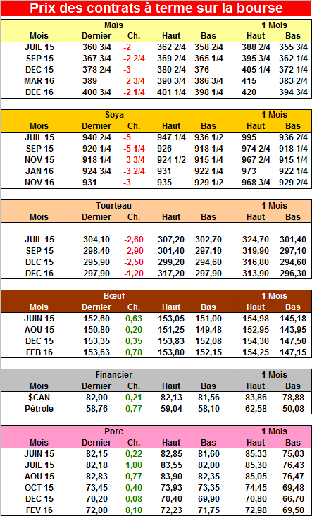 Le prix du maïs continue de baisser et les producteurs doivent rester prudents car la tendance reste très négative pour l’instant comme vous pouvez le constater dans le graphique. La météo est idéale en début de saison pour les agriculteurs et la prime de risque baisse tranquillement sur les contrats jour après jour. Un scénario de prix de 3.00$ - 3.25$ est possible si les conditions continuent d’être si favorables.