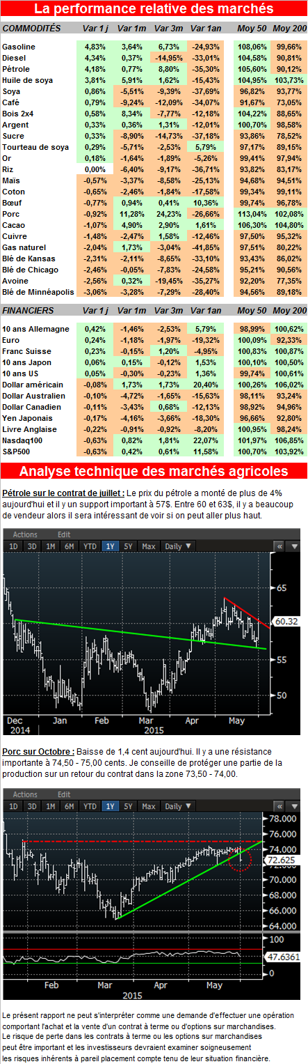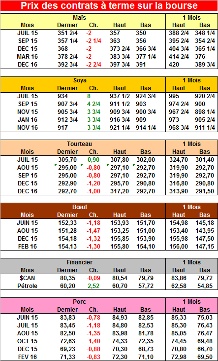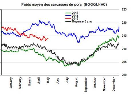 Le prix de la découpe de porc a remonté de 2.17 cents aujourd’hui à 86.80 cents et à presque effacé la forte baisse d’hier. Les prix depuis une semaine sont plus volatils et cela explique pourquoi le prix des contrats a de la difficulté à passer la résistance importante à 85 cents sur les mois d’été. Un élément important à surveiller sera l’évolution du poids des carcasses au cours des prochaines semaines. Le poids est présentement de 213.4 livres en baisse par rapport à l’année dernière, mais toujours 3.4% supérieur à 2013. Les abattages de porcs au deuxième trimestre de cette année sont anticipés en hausse de 3.6% par rapport à 2013. Par conséquent, on parle de possiblement une hausse de l’offre de viande de presque 7% sur deux ans en livres. La demande devra rester forte et les exportations également pour que la tendance haussière des prix se poursuivre.