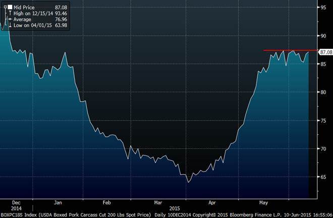 Le prix de la découpe de porc a remonté encore aujourd’hui de 0.34 cent à 87.08 cents. Comme vous pouvez le constater dans le graphique nous sommes de retour sur le haut de la récente zone de congestion entre 85 et 87 cents et une brisure en haut de 87.5 cents est nécessaire pour faire monter le prix des contrats d’été.