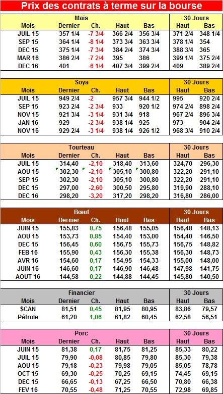 La demande pour le soya est un peu plus forte que prévu et les inventaires de fin d’année 2015/16 devraient être de 475 millions de boisseaux comparativement à des estimés de 500 millions le mois dernier. Les inventaires mondiaux de maïs anticipés pour la fin de l’année 2014-2015 risquent d’augmenter de 2.3% à 197.01 millions de tonnes. La production au Brésil a été révisée à 81 millions de tonnes en hausse de 3 millions par rapport au dernier mois. Il est à noter que le Brésil produit maintenant 8.1% du maïs mondial après les États-Unis avec 36% de la production et la Chine à 21%. Au Canada, notre production représente 1.15% du totale avec 11.5 millions de tonnes.