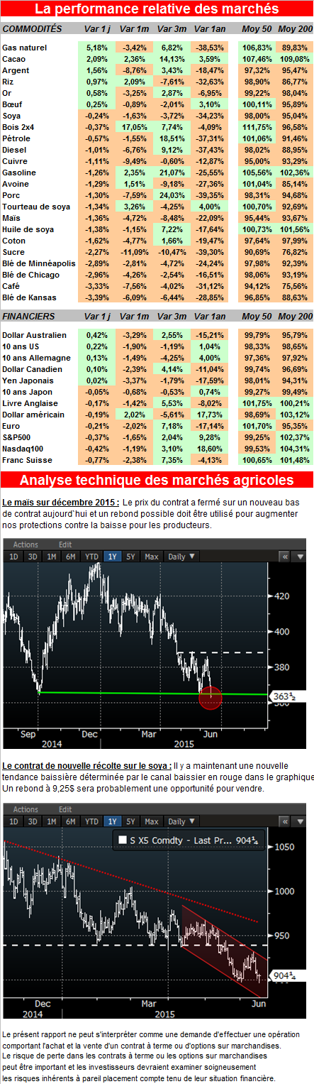 La nouvelle vendredi que la Russie et la Roumanie avaient vendu au total 180,000 tonnes de blé à l’Égypte démontre que le prix américain est trop élevé et les ventes à l’exportation risquent de diminuer encore. Le rapport de la USDA, la semaine dernière, avait rappelé au marché que les inventaires mondiaux de grains sont élevés et que, par conséquent, la compétition risque d’être très féroce pour s’accaparer les parts de marchés.