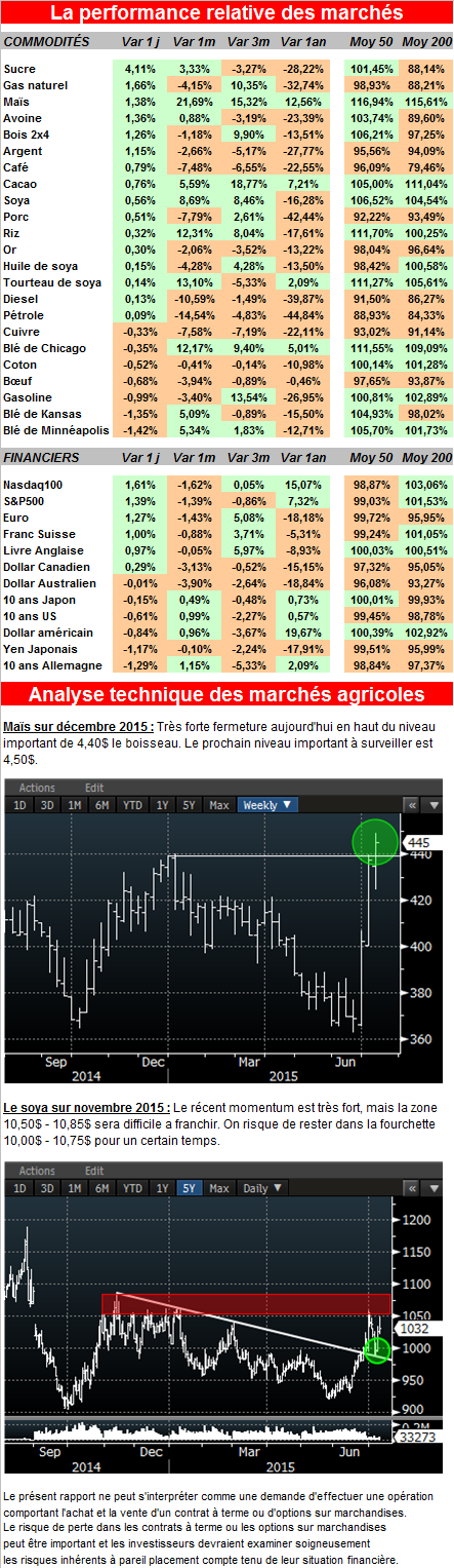 La USDA a décidé d’attendre le mois prochain avant de changer ses estimés concernant les rendements estimés pour le maïs et le soya. Par conséquent, les inventaires estimés pour la fin d’année 2015/16 étaient plus élevés que le marché l’avait anticipé et la réaction initiale a été négative sur le prix du maïs (voir graphique). Le marché a ensuite remonté de 12 cents sur la perception que la USDA va surement réajuster les rendements plus rapidement le mois prochain. Il y a toujours beaucoup de précipitations d’annoncées et le rapport de lundi prochain après la fermeture sur les conditions des récoltes sera très important à surveiller.