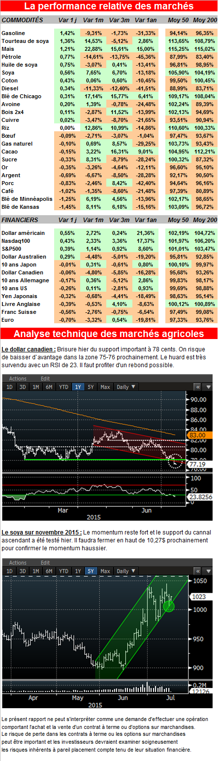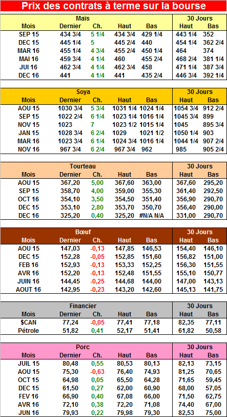 Le prix du maïs semble vouloir se stabiliser à 4.50$ le boisseau présentement et un rendement de 162.5 boisseaux à l’acre serait possiblement l’anticipation du marché actuellement et pour monter à 5$ il faudra d’avantage de problèmes qui feraient baisser le rendement à 160 boisseaux environ.