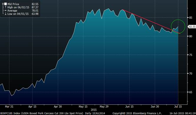 Le prix de la découpe de porc hier a terminé la journée en hausse de 0.72 cent à 82.55 cents et en regardant le graphique plus bas il semble y avoir un support à 81 cents. Le prix du bacon continue d’impressionner et de supporter les prix.