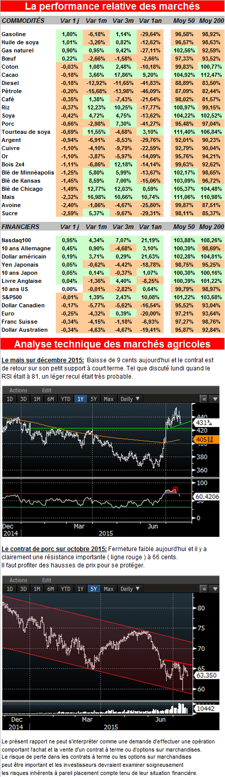 Fermeture faible sur les grains aujourd’hui et également sur le prix des autres matières premières. Un élément important à souligner est la vigueur du dollar américain cette semaine qui est négatif pour le prix des commodités. Les bulletins météo annoncent aussi sur le long terme du temps plus sec dans le « corn belt » qui devrait fortement aider le maïs et le soya. Il ne faut pas oublier que la qualité du maïs est restée stable en moyenne depuis les deux dernières semaines et que le marché restait haut en anticipation de fortes pluies à venir.
