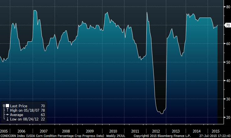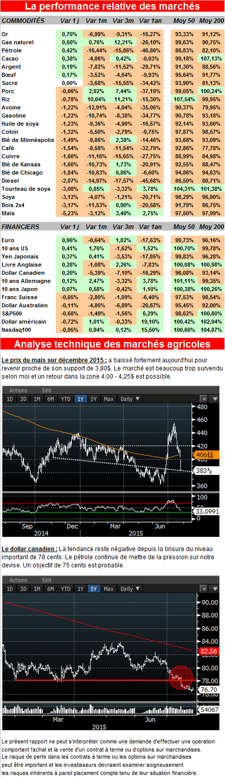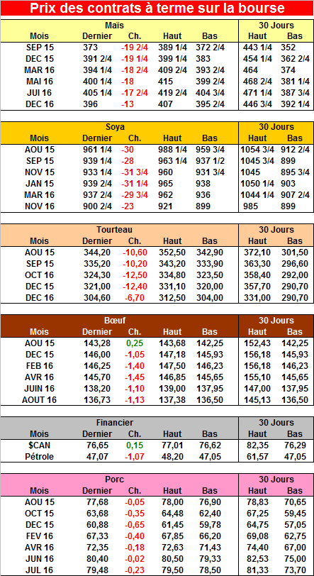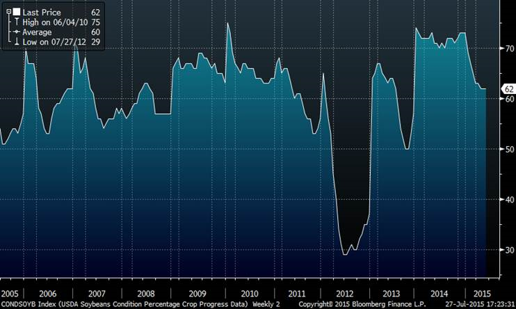 La baisse de 8% de la bourse chinoise aujourd’hui a été un des principaux éléments expliquant la forte correction du prix des grains en plus des bulletins météo favorables en moyenne pour les cultures. Le soya reste cependant à 62% bon ou excellent et pour l’instant on est encore sous les niveaux de 2009 et 2010 quand le rendement moyen était de 43.8 boisseaux à l’acre. Le rendement estimé de la USDA de 46 boisseaux à l’acre est possiblement trop élevé pour cette année. 2 boisseaux de moins à l’acre et les inventaires de fin pourraient potentiellement baisser à 250 millions de boisseaux si la demande reste forte…(à suivre en partie avec les ventes à l’exportation de chaque semaine).