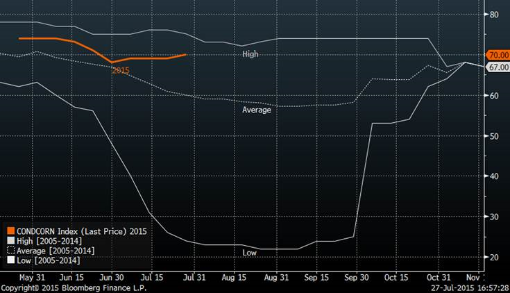 · 70% du maïs est jugé en bonne ou excellente condition (hausse de 1 point sur une semaine).