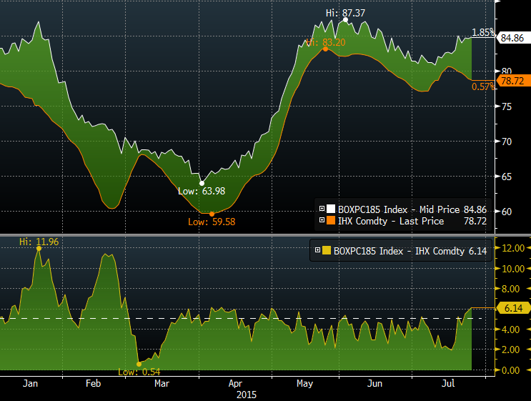 Le prix des contrats de porc a légèrement baissé aujourd’hui suite à une baisse de 1 cent du prix au comptant de la carcasse américaine. Le prix de la découpe est sur une petite tendance haussière dernièrement et cela va probablement aider le prix des contrats si on brise les 85 cents prochainement. Notez dans le graphique 5 que l’écart est maintenant relativement élevé à 6 cents entre les deux (bonne indication pour la marge d’abattage). Par conséquent, si le prix de la découpe reste proche des 85 cents, le prix du contrat d’août pourrait avoir de la difficulté à retourner en bas de 76 cents.