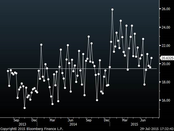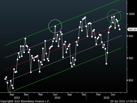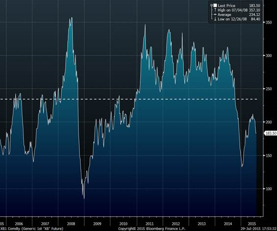 Tel que vous pouvez le constater dans le graphique 1, la tendance de la production d’éthanol est à la hausse depuis les 2 dernières années et la cible de la USDA de 5.225 milliards de boisseaux est très atteignable pour l’instant. Je pense même que la USDA va probablement augmenter de 50 à 100 millions, d’ici la fin de l’année, ses estimés pour la consommation de maïs à l’éthanol. La forte baisse du prix de l’essence aux États-Unis depuis le début de l’année (graphique 3) a eu comme effet de faire augmenter le nombre de kilomètres parcourus. De plus, la forte croissance de l’emploi fait augmenter automatiquement la consommation d’essence et par le fait même la consommation l’éthanol. Selon l’agence américaine la « US Federal Highway Administration » le nombre de kilomètres parcourus par les automobilistes américains a augmenté de 3% entre le mois de mai 2014 et 2015 et la tendance est fortement à la hausse.