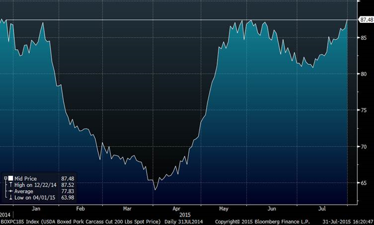 Le prix de la découpe de porc de retour sur ses hauts de l’année à 87.48 cents