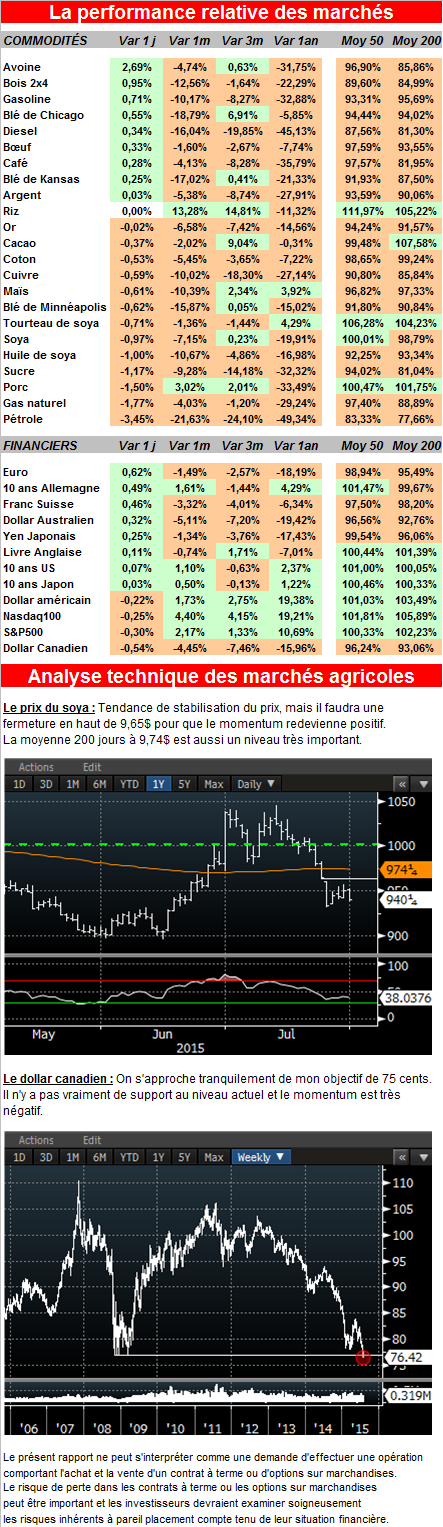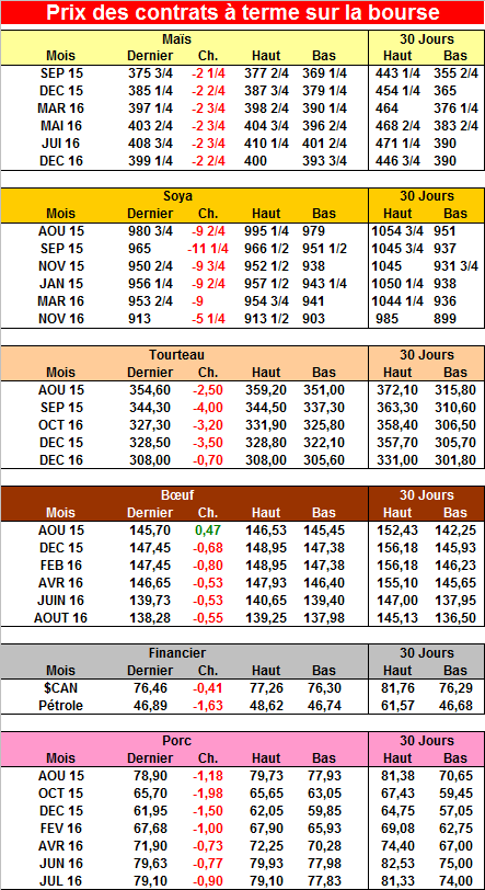 Le réal brésilien est en baisse de 30% cette année par rapport au billet vert. Plusieurs négociants estiment que les exportations américaines de soya pour la prochaine année pourraient baisser de 40 à 80 millions de boisseaux rapportait le « High Tower Report ». Les exportations cette semaine étaient fortes, mais une semaine ne fait pas une tendance.