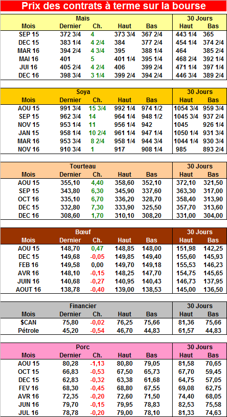 Le prix du maïs et du soya a remonté aujourd’hui et le marché semble développer un niveau plancher actuellement. Si le rendement dans le maïs est au final de 164.7 boisseaux à l’acre et que la demande reste relativement forte, les inventaires de fin de saison seront possiblement près des 1.4 milliard de boisseaux. Par conséquent, je pense que le niveau actuel est beaucoup plus intéressant pour les acheteurs et qu’il faut penser à sécuriser des prix.