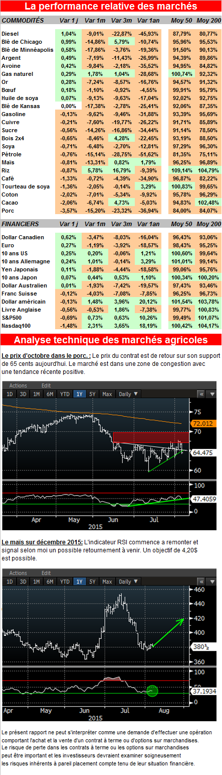 Le prix des contrats de porc a fortement baissé aujourd’hui en raison d’une anticipation de baisse du prix de la découpe prochainement. Les exportations de porcs du mois de juin ont montré que le volume en direction de la Chine a baissé de 4.8%. Je pense que le marché a été déçu de ne pas voir une augmentation.