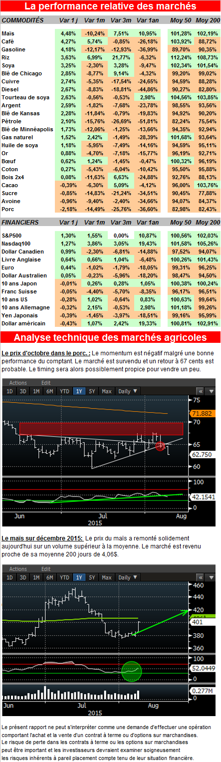Le prix du porc a baissé à nouveau aujourd’hui et le contrat d’octobre est de retour proche de son support à 63 cents. Les nouvelles sont pourtant relativement positives avec une production en livres, la semaine dernière, en hausse de 8.8% sur un an et sous la barre des +10% pour la première fois depuis la semaine du 12 juin dernier. Le prix du jambon et du bacon continue de remonter et de faire supporter le prix de la découpe. Le prix du contrat va-t-il rebondir encore à 67 cents ?