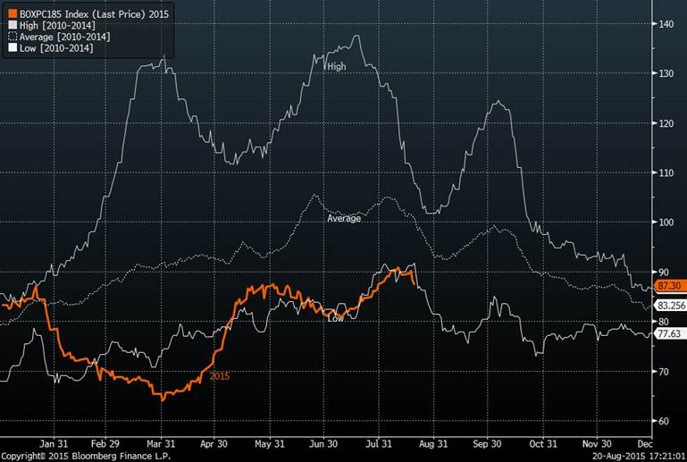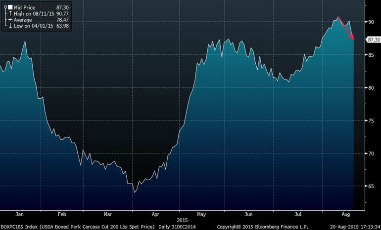 Le prix des contrats de porc a rebaissé aujourd’hui sur un marché au comptant en baisse. Le prix de la découpe, qui était très fort dernièrement principalement en raison du bacon, a fortement baissé de presque 3 cents en deux jours seulement. Il est à noter que normalement les prix commencent à baisser rapidement à partir de la première semaine d’août pour atteindre un creux vers la fin de l’année (voir graphique).