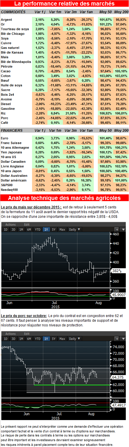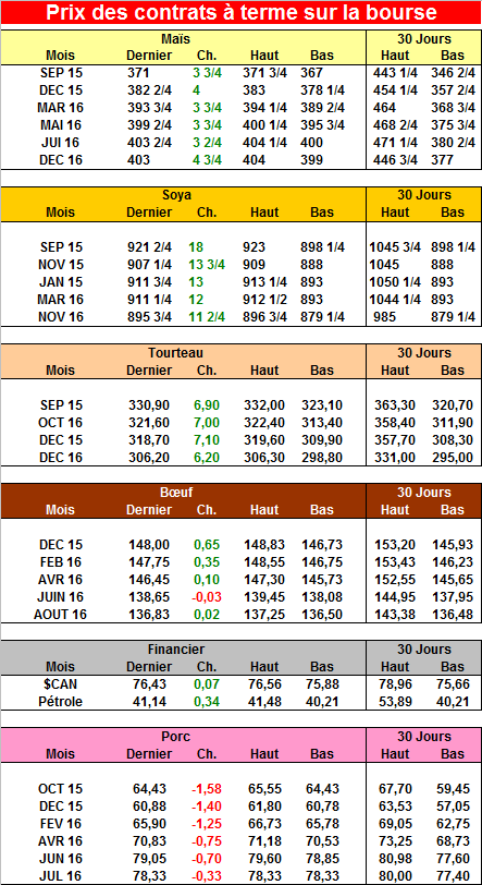 · Des rumeurs de ventes importantes de soya américains en direction de la Chine propulsent le soya 15 cents à la hausse (source : The Anderson).