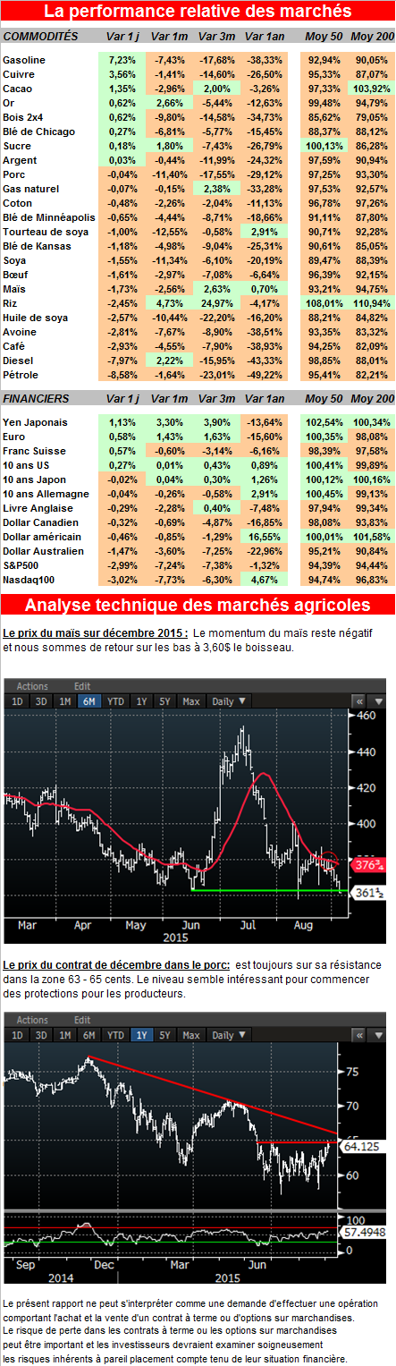 · Informa augmente ses estimés pour la récolte de maïs à 13.63 milliards de boisseaux et est pratiquement en ligne avec ceux de la USDA. Pour le soya, elle estime que la récolte sera de 3.873 milliards de boisseaux comparativement à des estimés de 3.916 de la USDA dans son dernier rapport.
