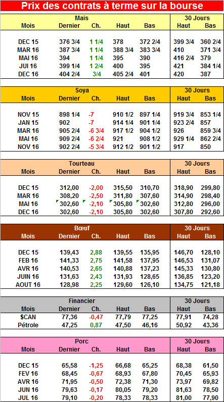 · Baisse du comptant dans le porc aujourd’hui malgré une hausse de 1.49 cent du prix de la découpe à 89.31 cents. La production de porc pour la semaine est estimée en hausse de 6.13% en nombre de porcs comparativement à l’année dernière. Par conséquent, la demande est très forte pour justifier un prix de la découpe à presque 90 cents !