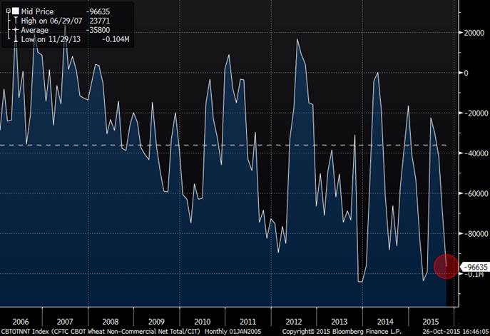 Hausse de 3.8% du prix du blé aujourd’hui en raison d’un manque d’eau dans beaucoup de régions importantes pour la production. Selon UkrAgroConsult, la production de blé d’hiver de l’Ukraine cette année risque d’être la plus faible depuis 2006. Les fonds de couverture sont également toujours très vendeur sur le marché avec 96k contrats soit plus du double de leur position moyenne depuis les 10 dernières années. La tendance est toujours négative sur le prix, mais le marché pourrait remonter un peu plus haut à court terme à cause des rachats possible des « Hedge Funds »