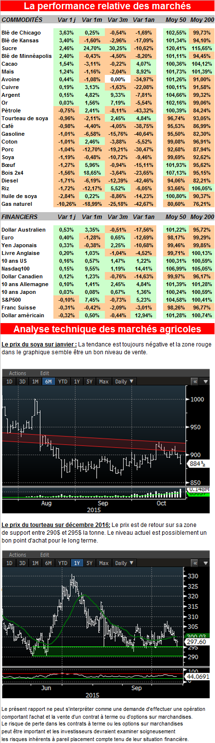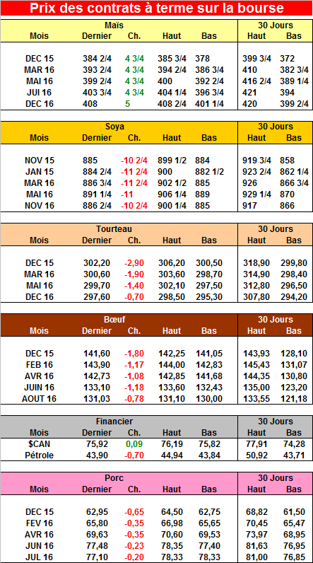 · 87% du soya, selon la USDA, est récolté comparativement à 80% pour la moyenne 5 ans.