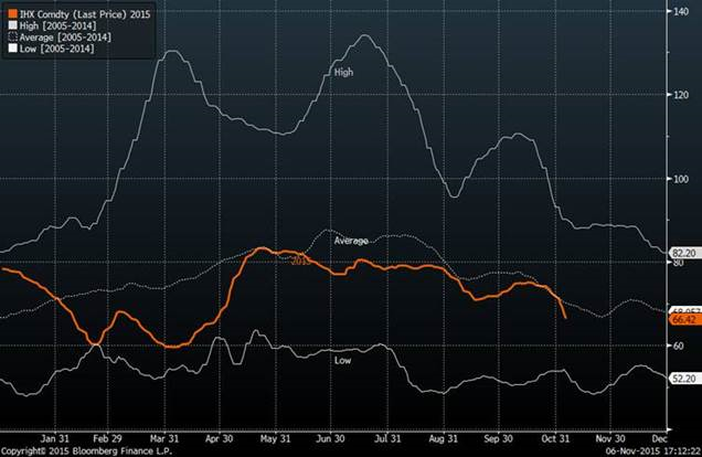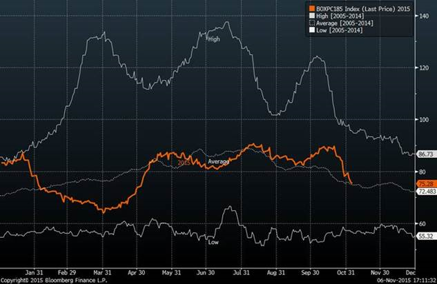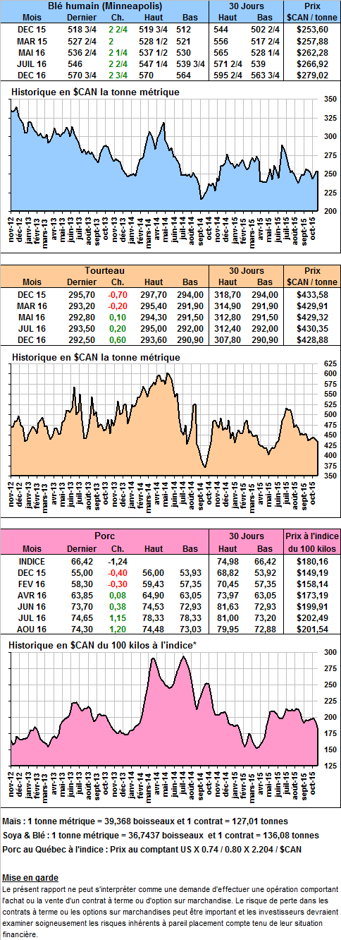 · Baisse du prix de la découpe de porc à 75.28 cents. Le prix est de retour sur la moyenne 10 ans (voir graphique 1). Le prix de la carcasse de porc est passé en bas de sa moyenne 10 ans (voir graphique 2). Les anticipations actuelles sont très négatives avec le contrat de décembre à 55 cents. Le bas des 10 dernières années sur le comptant pour la mi-décembre est 55 cents !