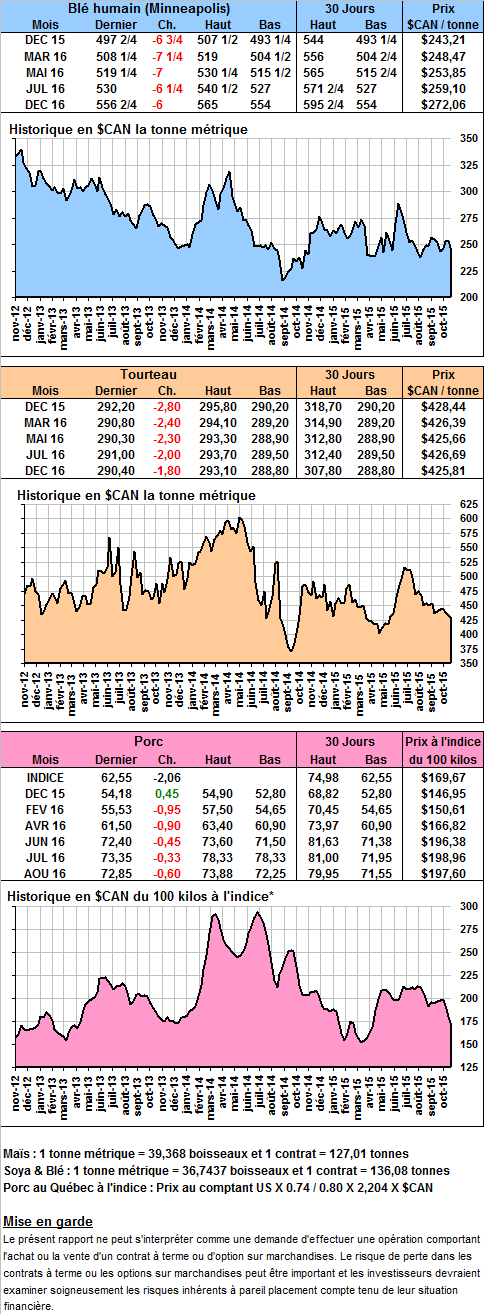 · La USDA anticipe maintenant des inventaires de maïs à 1.760 milliard de boisseaux donc 199 millions de boisseaux de plus que le mois dernier. L’agence américaine a baissé de 50 millions ses estimés pour les exportations et de 75 millions la consommation pour l’éthanol. Le rendement anticipé est maintenant de 169.3 boisseaux à l’acre comparativement à 168.0 le mois dernier. Par conséquent, la production est maintenant prévue à 13.65 milliards de boisseaux (99 millions de boisseaux de plus que dans le dernier rapport).