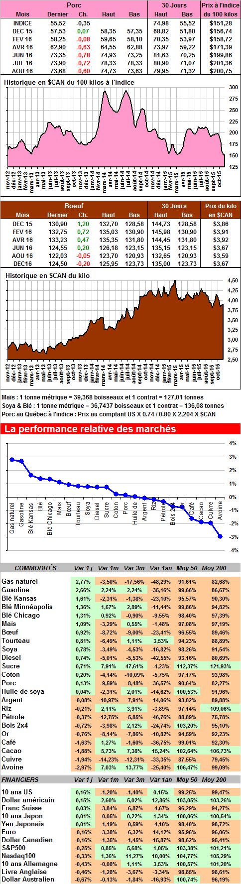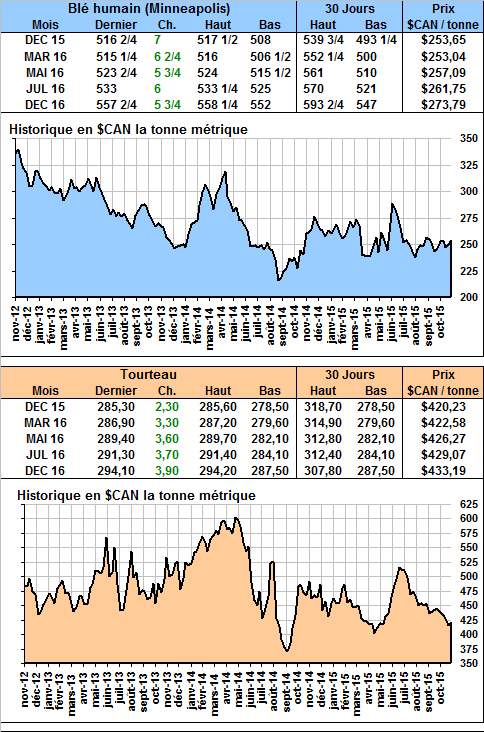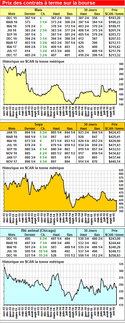 · Le maïs remonte de 4 cents aujourd’hui sur des anticipations que la demande est possiblement un peu plus forte. En effet, les inspections pour les exportations étaient 30% supérieures que la semaine dernière. De plus, la production d’éthanol était également un plus élevée. Il faut noter que les fonds de couverture ont une position « short » très importante en maïs et blé et que le marché peut ainsi rebondir plus facilement. La situation globale n’a pas changé et on risque de se retrouver avec des inventaires mondiaux de maïs les plus élevés des 10 dernières années.