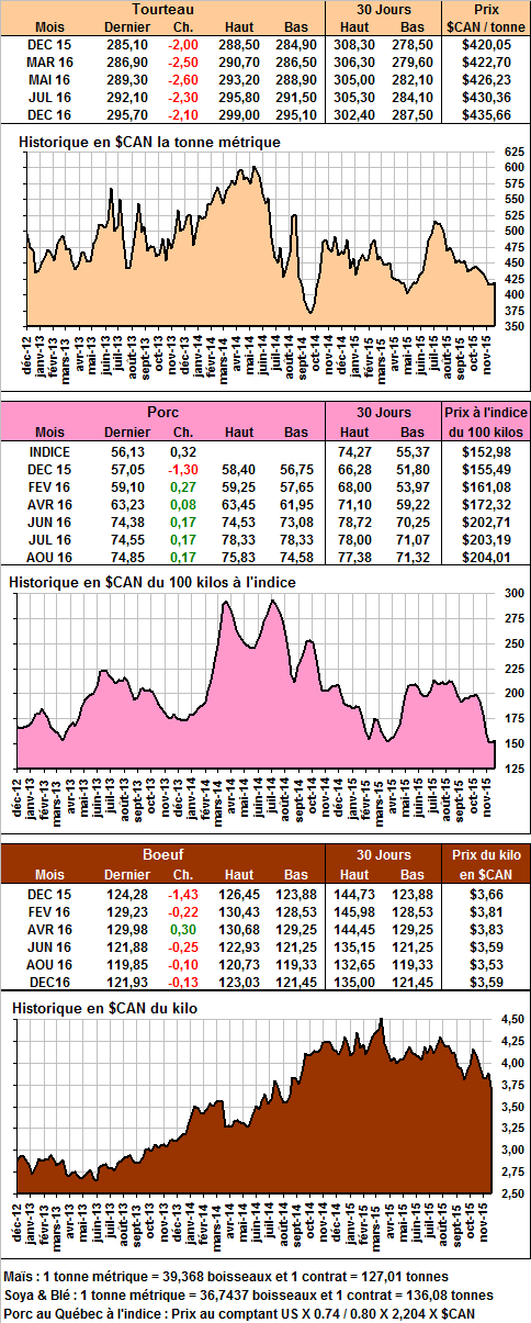 · Le prix de la découpe de porc a terminé la semaine en baisse de 0.35 cent à 73.73 cents. Le prix a monté de 1.3 cent pour la semaine et il semble y avoir un support au niveau actuel de 72 – 73 cents. La marge actuelle d’abattage est très élevée et le prix du comptant risque de continuer à remonter au cours des prochains semaines.