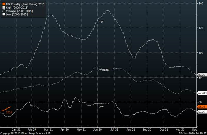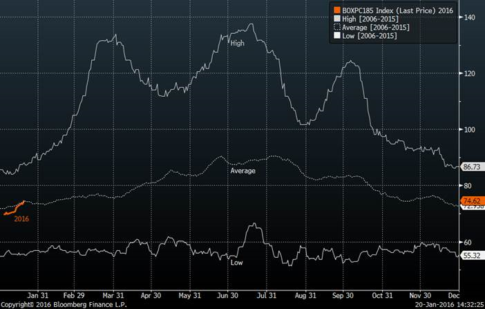 · Le prix de la découpe de porc a très bien performé depuis le début de l’année et le prix est maintenant de retour sur la moyenne 10 ans. Le prix de la carcasse de porc a encore du chemin à parcourir pour revenir sur la moyenne 10 ans et cela explique pourquoi les marges d’abattages sont aussi élevées présentement (voir graphique). On peut ainsi voir les contrats d’été monter à 80 éventuellement.