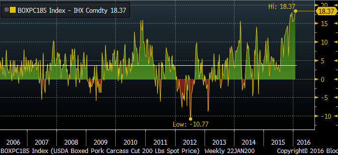 Historique de l’écart entre la découpe et la carcasse de porc (bonne indication pour la marge)
