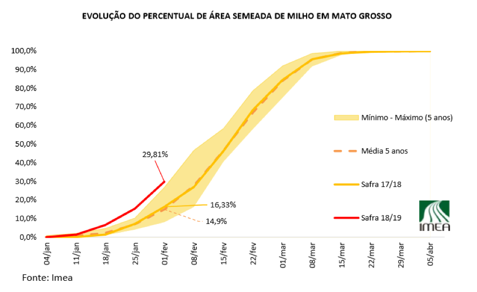 Ci-dessous, un graphique de l'IMEA qui révèle la vitesse des ensemencements du maïs safrinha dans l'État du Mato Grosso. La zone en jaune représente le minimum et le maximum des ensemencements au cours des 5 dernières années. La ligne en rouge est le pourcentage semé pour 2018-19, la ligne jaune est pour 2017-18, et la ligne pointillée est pour la moyenne de 5 ans.