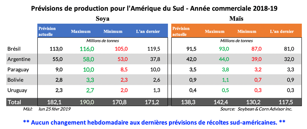 Alors qu’il était au stade de remplissage des gousses, le soya à maturation hâtive a durement été touché par le temps chaud et sec de décembre et du début de janvier dernier. Par conséquent, les rendements ont chuté de 30 % à 40 % et demeurent très variables. Le soya à maturation tardive a bénéficié de l’amélioration des précipitations qui a commencé vers la deuxième semaine de janvier pour se poursuivre jusqu’à aujourd’hui. L’amélioration des rendements de soya à maturation tardive devrait compenser en partie les rendements très faibles enregistrés pour le soya à maturité hâtive.