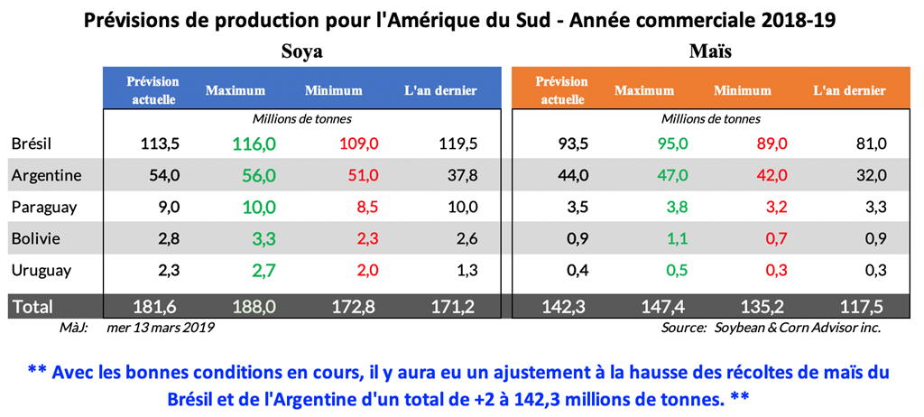 Soya Argentine – Au cours des 10 premiers jours de mars, le climat en Argentine a été relativement humide. En moyenne pour le mois, certaines régions ont déjà reçu le total de leurs précipitations. Les producteurs de soya sont inquiets parce qu’ils se souviennent du mois d’avril des deux dernières années, lorsque des averses presque constantes avaient été enregistrées pendant plusieurs semaines, alors que les semis de soya étaient prêts pour la récolte, entraînant ainsi une perte de 5 à 6 tonnes en 2016 et de 2 millions de tonnes en 2018. Il y a quelques averses prévues à court terme, nous devons donc surveiller la situation à l’avenir.