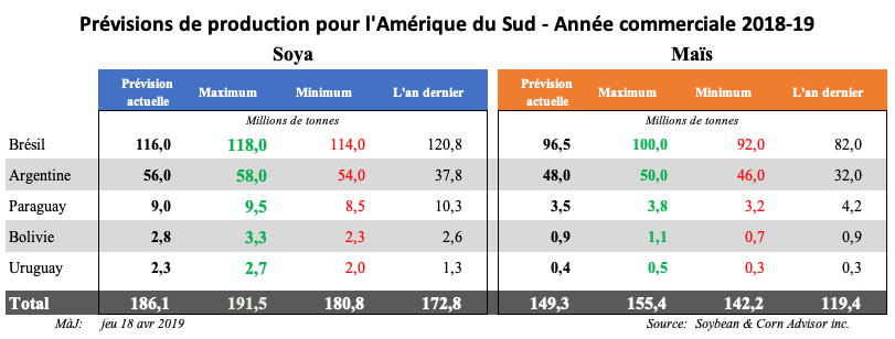 Dans son rapport hebdomadaire, le Buenos Aires Grain Exchange a évalué la récolte de soya 2018/2019 à 9,6 % «pauvre à très pauvre» et à 53,9 % «bon à excellent», ce qui est légèrement meilleur que la semaine dernière. L’humidité au sol pour le soya a été jugée à 12,8 % «déficiente à très déficiente» et à 35,6 % «optimum au surplus», ce qui est un peu moins bon que la semaine dernière.