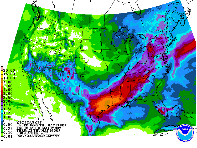 En date de lundi dernier, les semis de maïs 2019 aux États-Unis étaient inférieurs à la moyenne des 5 dernières années de 23 %. Compte tenu des prévisions météorologiques défavorables pour cette semaine, le pourcentage de maïs semé lundi prochain pourrait être inférieur de 25 % ou plus par rapport au rythme moyen.