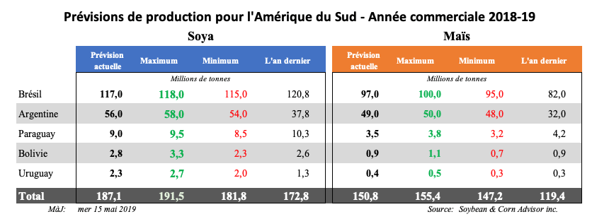 Dans son rapport de mai concernant l’offre et la demande (WASDE), le USDA a laissé son estimation de la récolte de soya brésilien 2018/2019 inchangée à 117,0 millions de tonnes. Sa première estimation de la récolte de soya brésilien 2019/2020 est de 123,0 millions de tonnes.