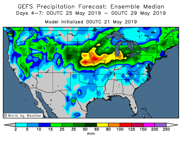 En Iowa, les semis sont terminés à 70 % (89 % pour la moyenne des 5 dernières années). Au Nebraska, les travaux sont complétés à 70 % (moyenne 86 %) et au Kansas à 61 % (moyenne 80 %). Dans l’est du Corn Belt, en Illinois, les semis sont finis à 24 % (moyenne 89 %). En Indiana, ils le sont à 14 % (moyenne 73 %). En Ohio, les ensemencements sont terminés à 9 % (moyenne 62 %). Dans le nord-ouest du Corn Belt, le maïs du Minnesota est semé à 56 % (moyenne 79 %). Au Dakota du Sud, les travaux sont finis à 19 % (moyenne 76 %). Au Dakota du Nord les semis sont complétés à 42 % (moyenne 63 %).