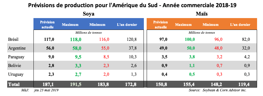 Bien que l’ANEC soit optimiste quant aux exportations de maïs brésilien en 2019, elle est plus prudente en ce qui concerne les exportations de soya brésilien en 2019. Selon ses estimations, les exportations brésiliennes de soya en 2019 s’élèveraient à 65 millions de tonnes, soit une baisse par rapport à son estimation d’avril qui était de de 67 millions de tonnes.